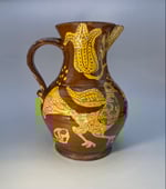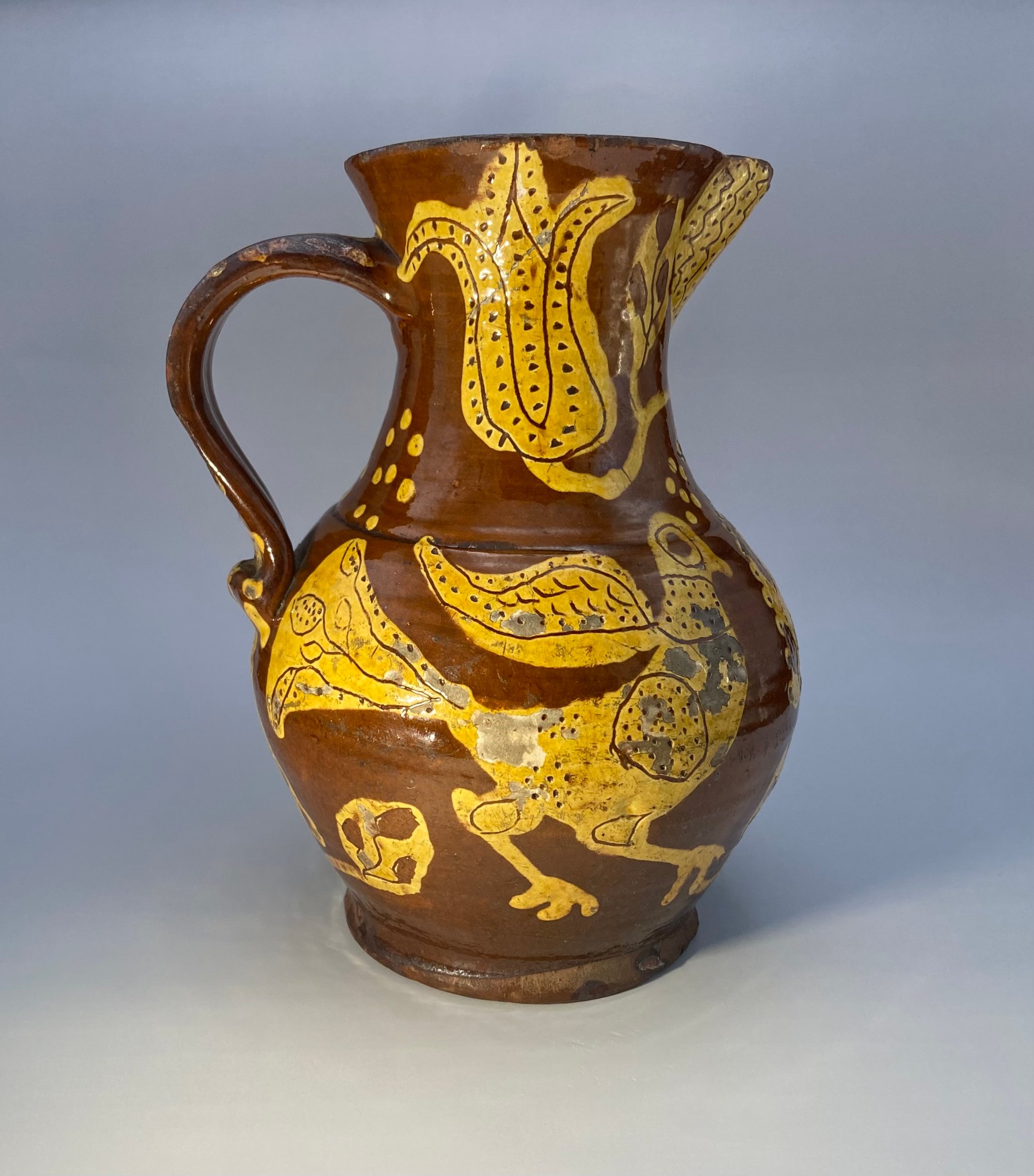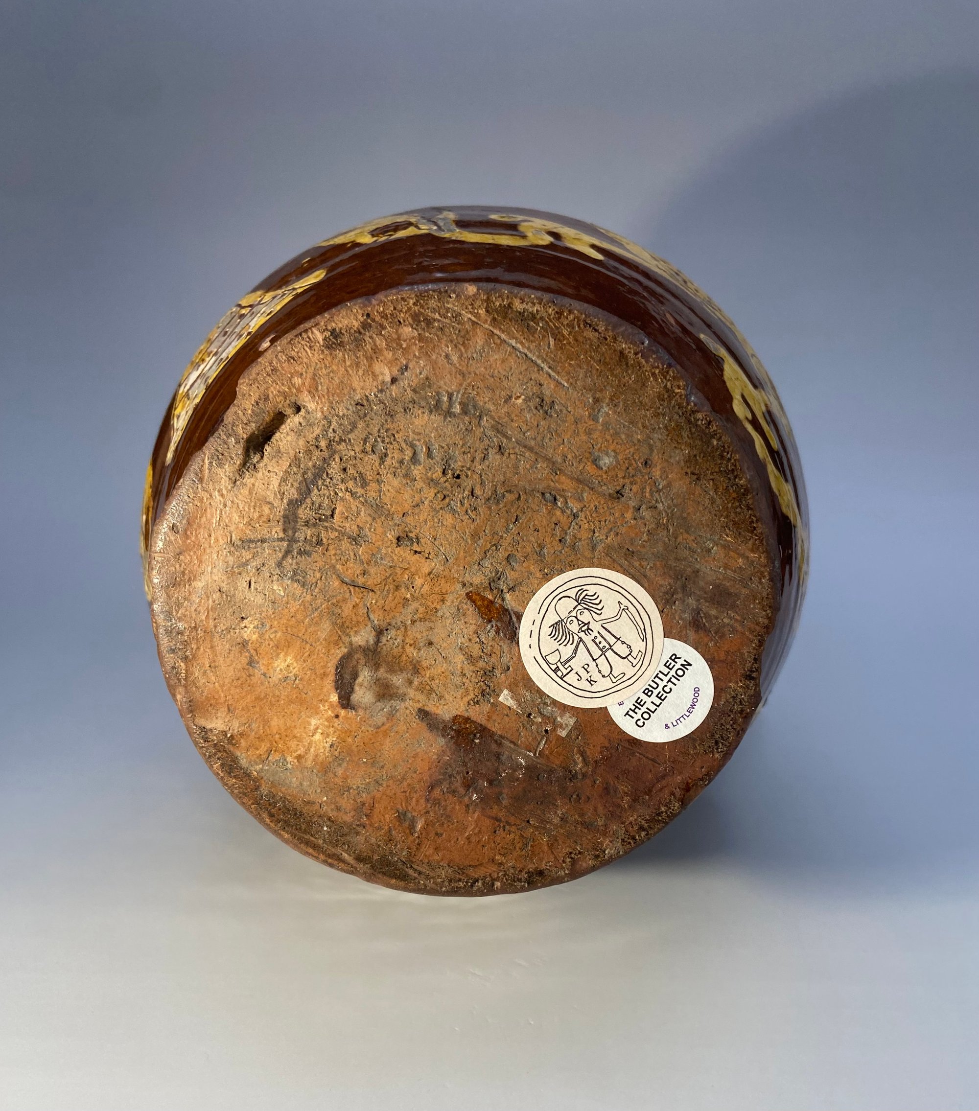 This charming baluster jug sits nicely amongst the slipware’s known as Harvest jugs, usually associated with North Devon; however, an attribution to Ewenny in Wales would seem more fitting.
