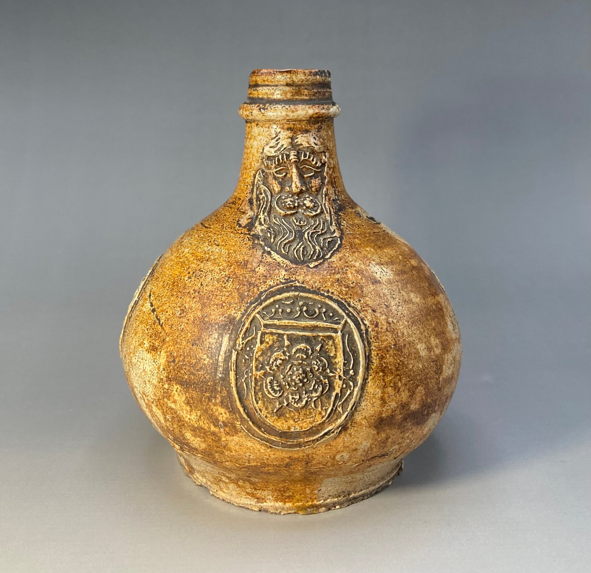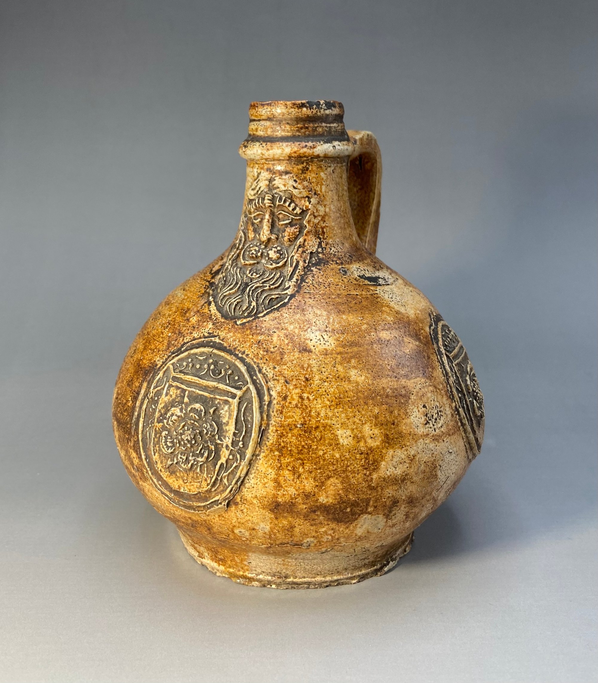 The jug is part of a rare group of Frechen Bartmann’s that are thought to of been ordered for the English market by Queen Elizabeth’s courtier Henry Noell during the final years of the sixteenth century.