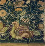 The cross stitch panel reveals in beautiful colour, a mythical cockatrice and flying wyvern, amongst over sized marigolds, and foliage. The cockatrice’s beady stare reminding us of their ‘death darting eye’.