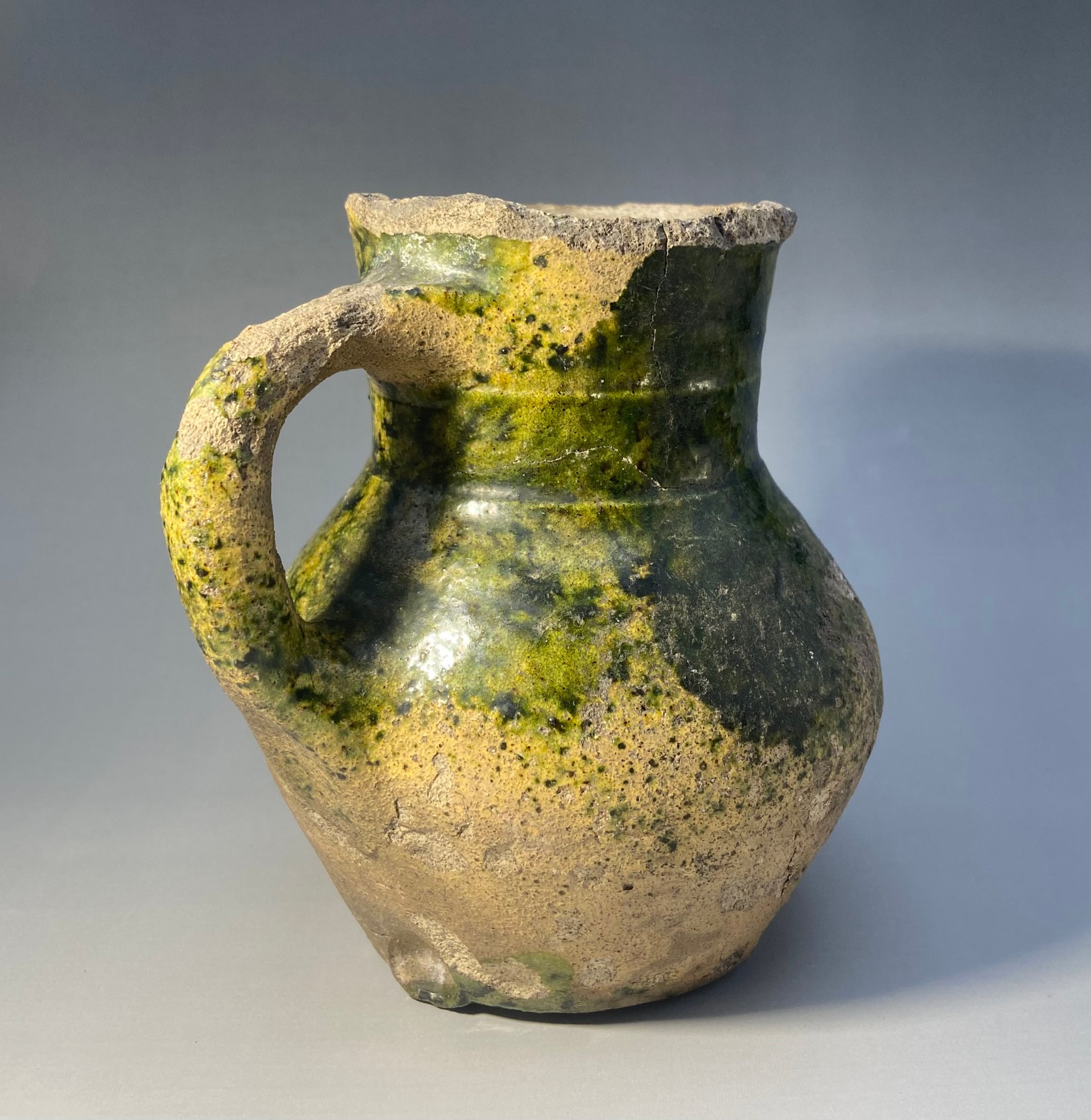 This exemplary, mottled green glazed, rounded drinking jug, is typical of the wares being manufactured at Kingston upon Thames during the second half of the Fourteenth century.