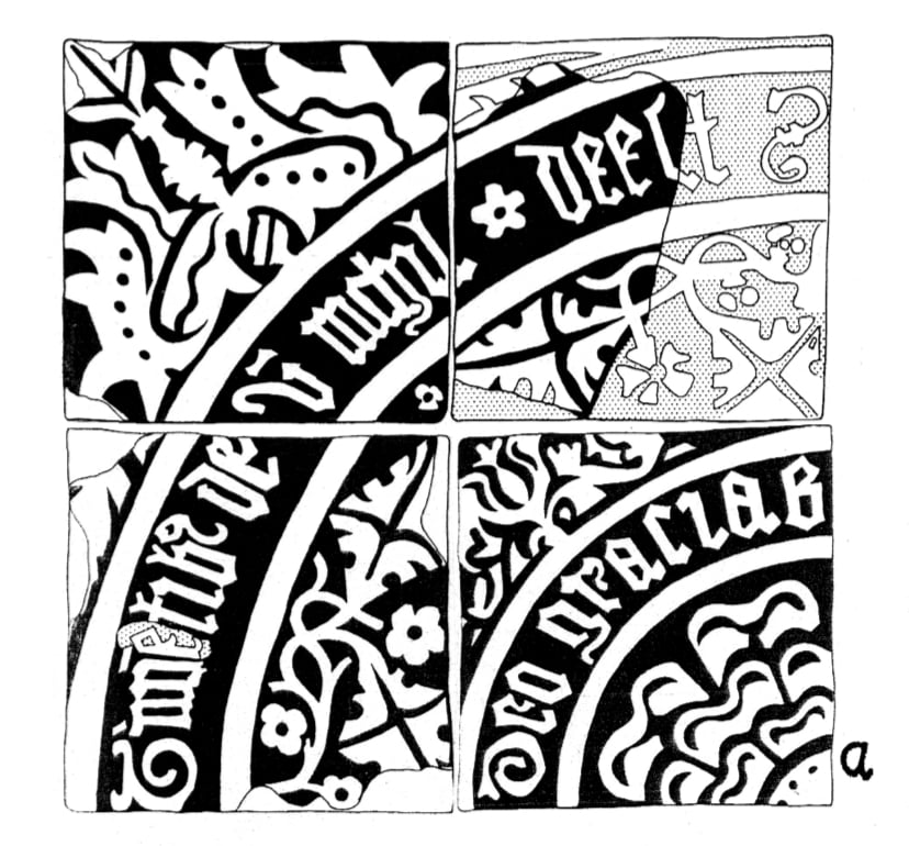 A quarter of a Tudor rose is surrounded by a quarter circle with the poignant inscription ‘Deo Gracias’ or ‘thanks be to God’. Believed to be a special commission for the priory; the design and workmanship of these Blackfriars tiles is exceptional.