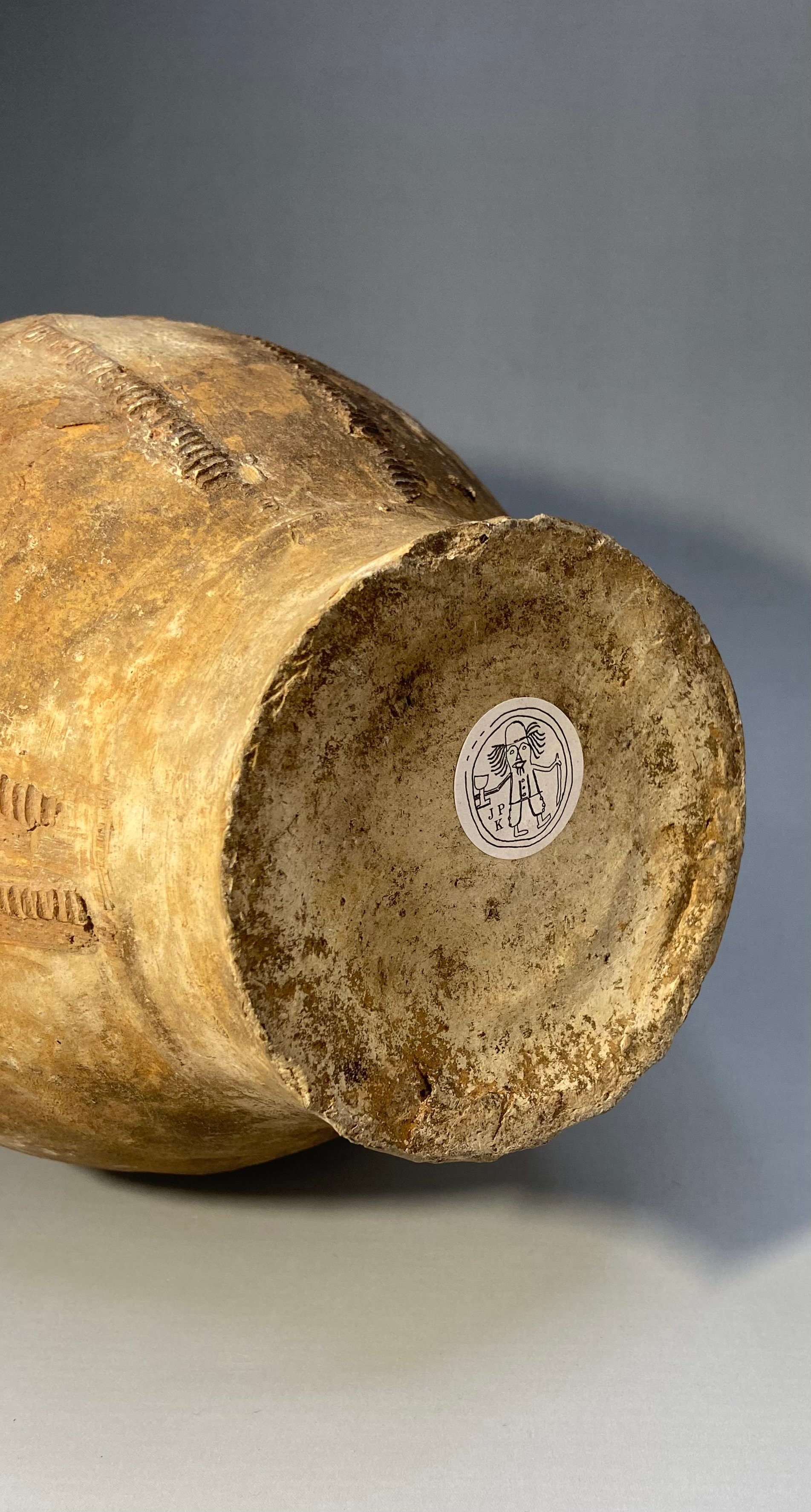 In true antiquarian fashion there remains a nineteenth century collectors label, applied seemingly as if part of the jugs design; the elegant inscription states an attribution to Montepensier and the thirteenth century.