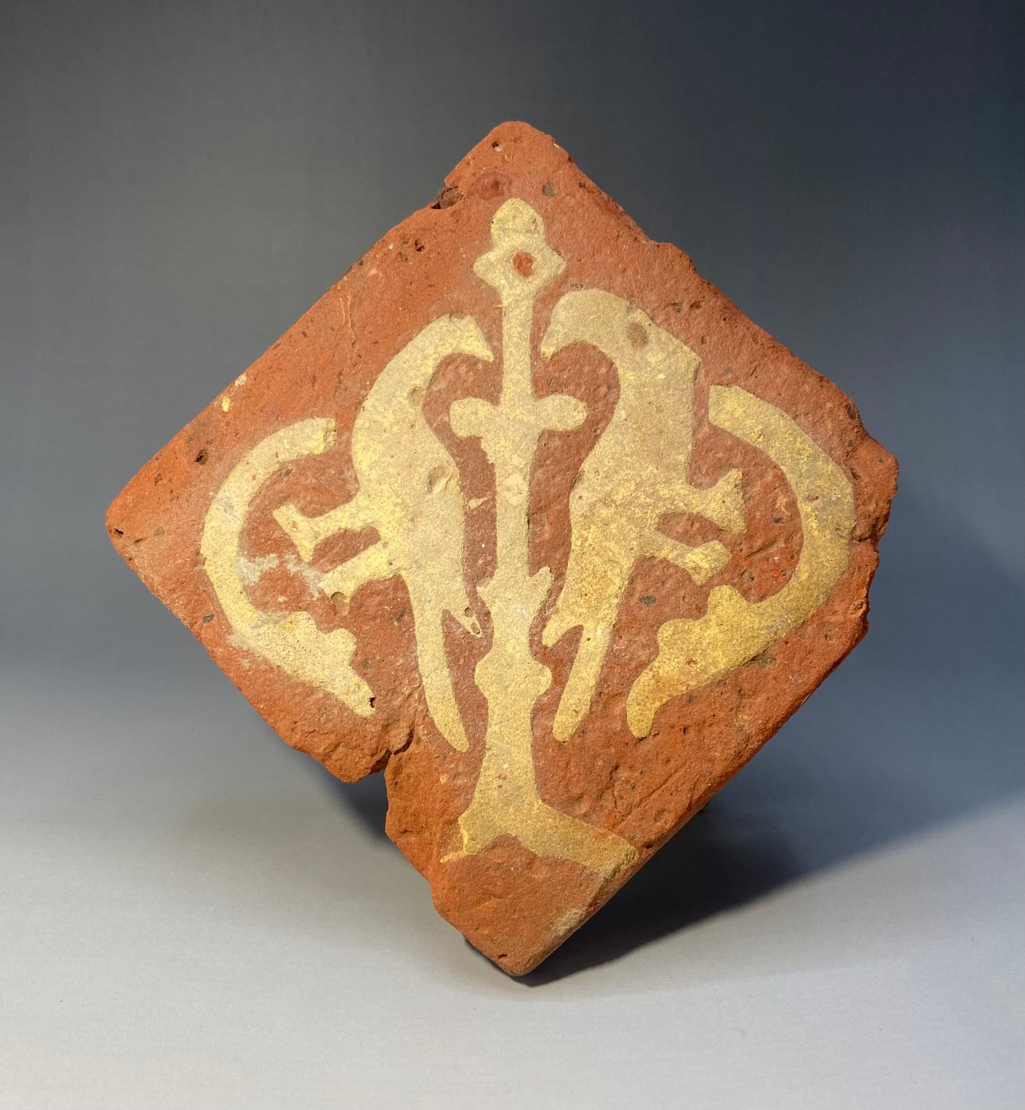This thirteenth century inlaid tile with its stylised fleur de lis flanked by two birds was a popular Wessex school design. Noticeably on account of the many surviving examples that can be attributed and seen throughout the ecclesiastical sites of the West Country.