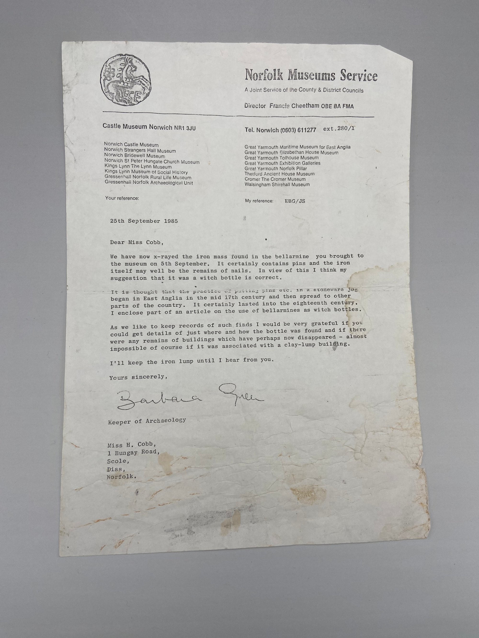 Recorded and documented is the finder of the bottles correspondence with the Norfolk Museum Services from September 1985 ( see pic three ) - An iron lump had been found in the bartmann jug, the contents was taken to Norwich castle museum ; assessed and x-rayed, with the result showing to contain pins. The museum concluded rightly that this was the amuletic ingredients of a witch bottle.